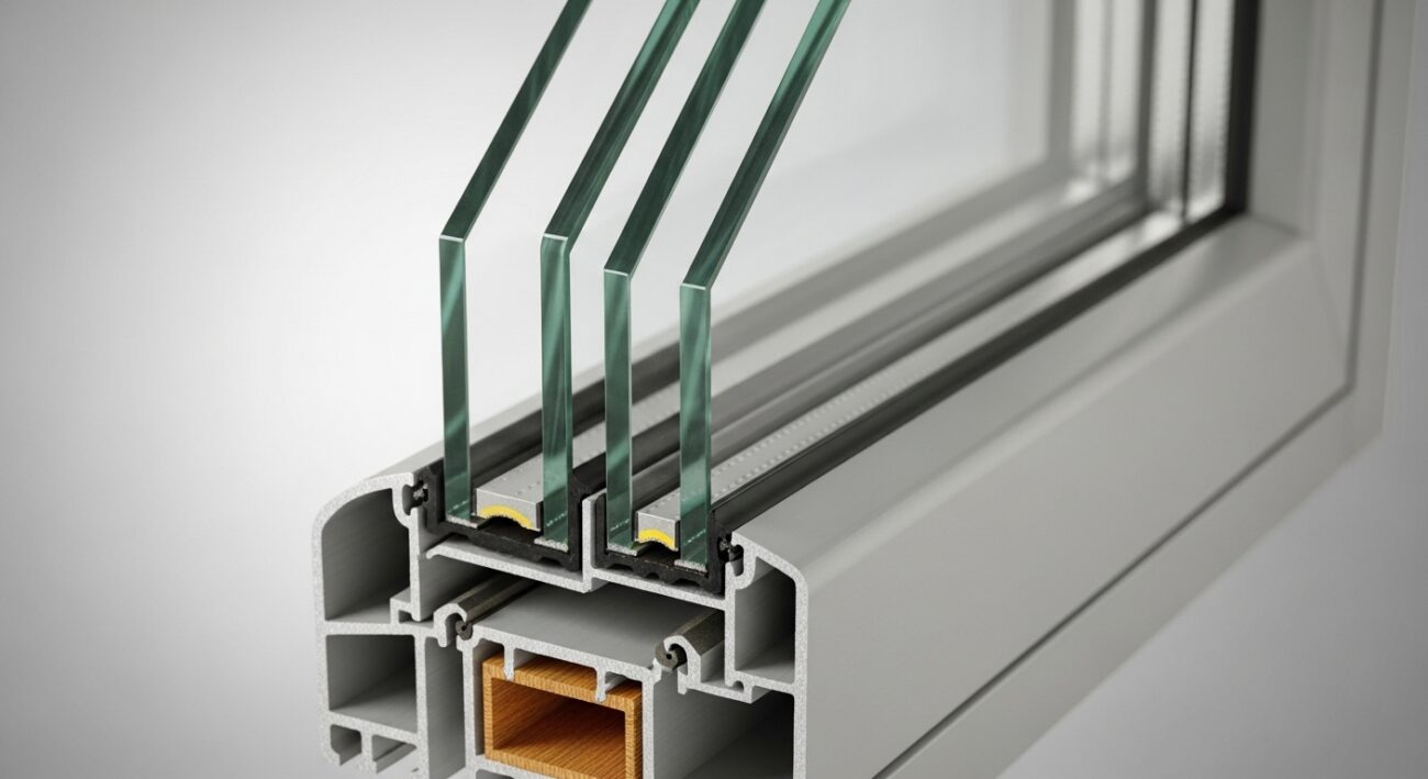 - Szyby zespolone dwukomorowe (potrójne szklenie): Składają się z trzech tafli szkła oddzielonych dwiema ramkami dystansowymi. Przestrzenie między szybami wypełnione są gazami szlachetnymi. Takie zestawy osiągają współczynniki Ug na poziomie 0,5 – 0,7 W/(m²K), co czyni je jednymi z najbardziej efektywnych i są standardem w budownictwie energooszczędnym i pasywnym.